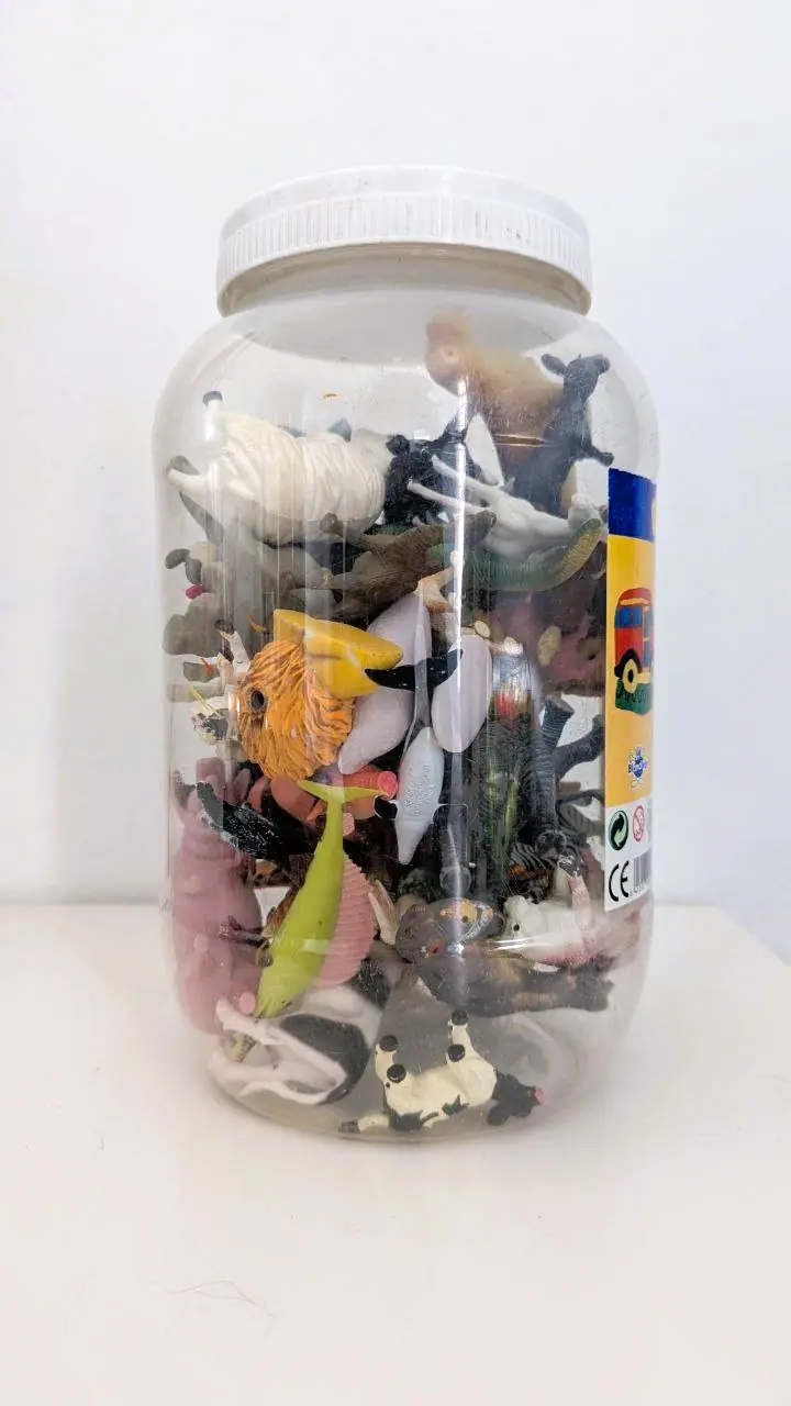 Lot de figurines mélangées, thèmes animaux sauvages et de ferme et dinosaures. Environ 60 figurines. Dimensions du contenant 25cm x 14cm de diamètre.